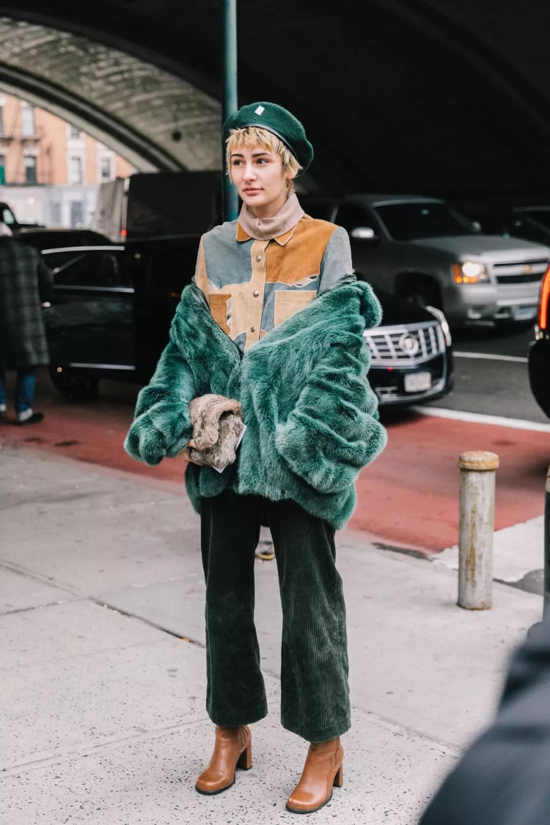 燈芯絨今年超火超流行,面料的紋路非常有美感了,搭配同色系水貂毛外套和貝雷帽,真是文藝極了,想立刻嘗試!!