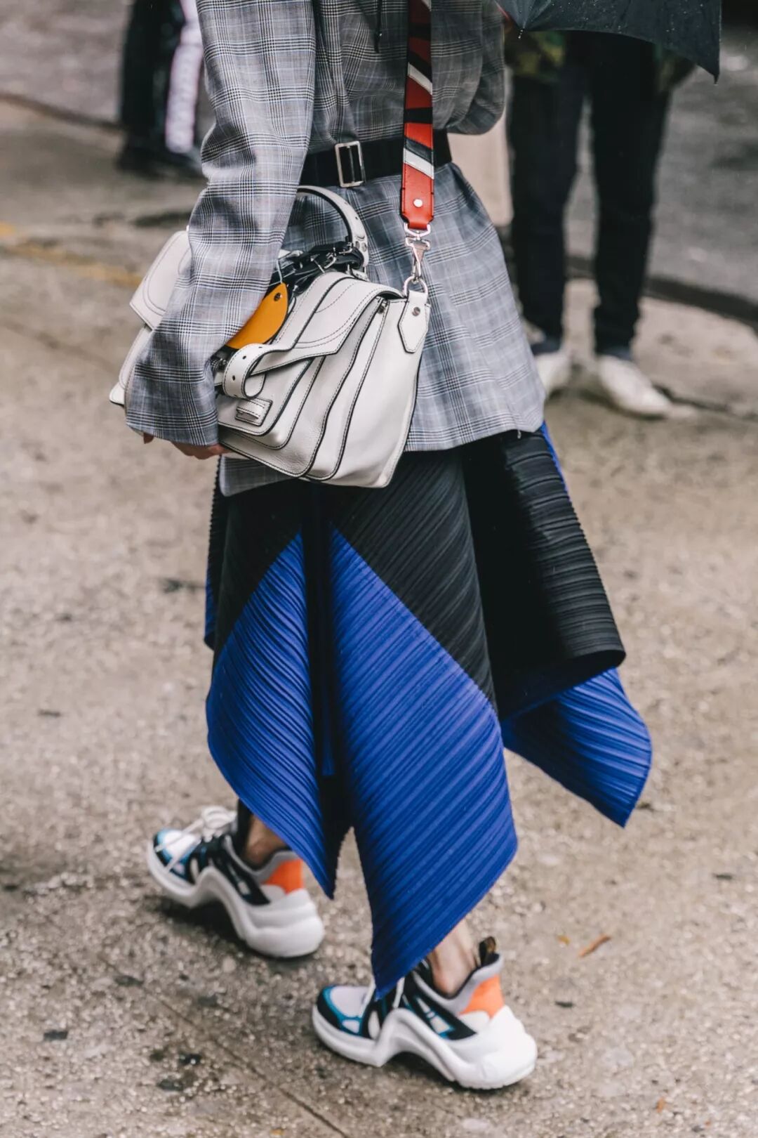 不對稱的半裙超級有個性了~拼色設計大膽又耀眼,踩上一雙老爹鞋,動感十足酷極了!