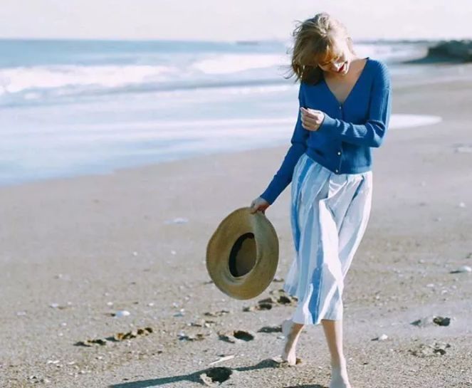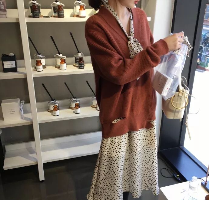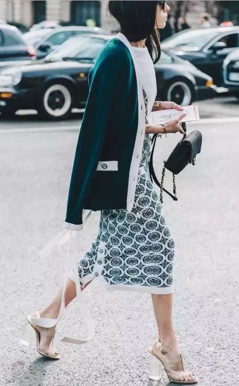 針織外套結合裙裝,慵懶之餘又多了幾分女人的浪漫。