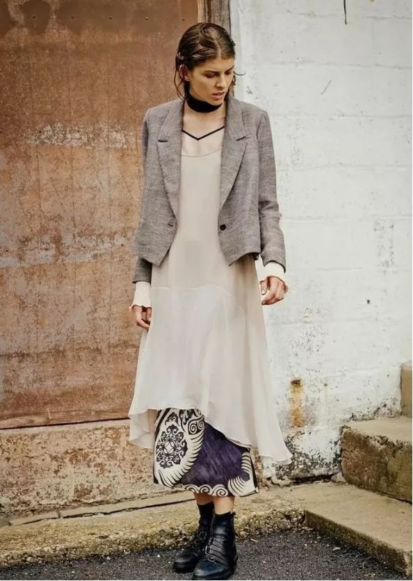 如果想要顯得更加有層次感一點,那麼就把連衣裙的袖子和領口都露出來。