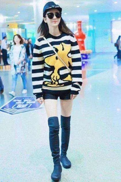 丫丫真的是太瘦了,看看這纖細的腿也是沒誰了。穿長靴自然是最好看,更顯腿長,搭配上童趣十足的毛衣更顯元氣少女風。