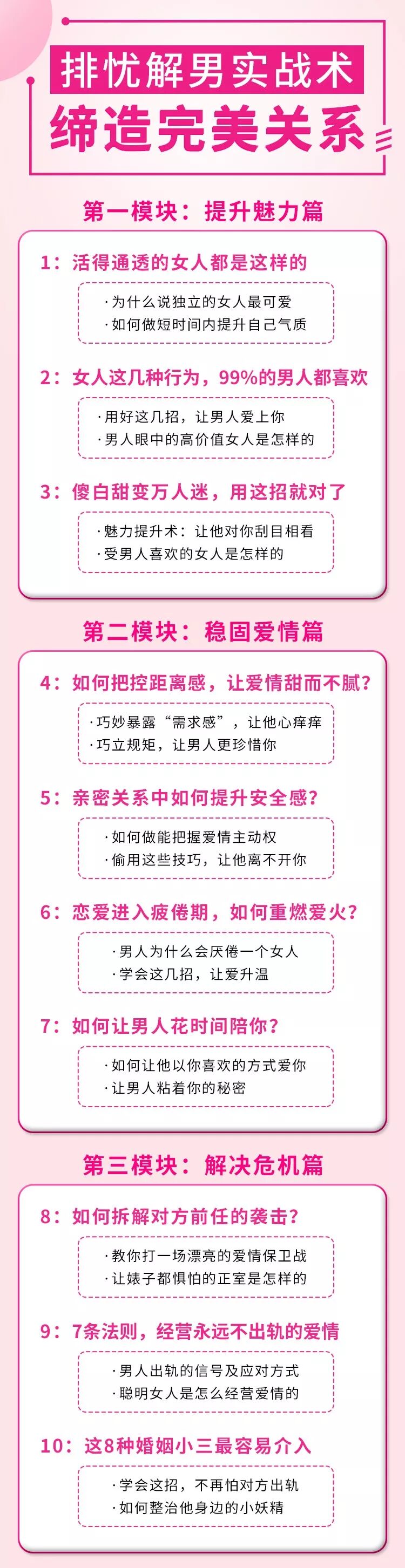 推出了這門共有30個核心知識點的系列課程:《排憂解男實戰術,締造完美關係》