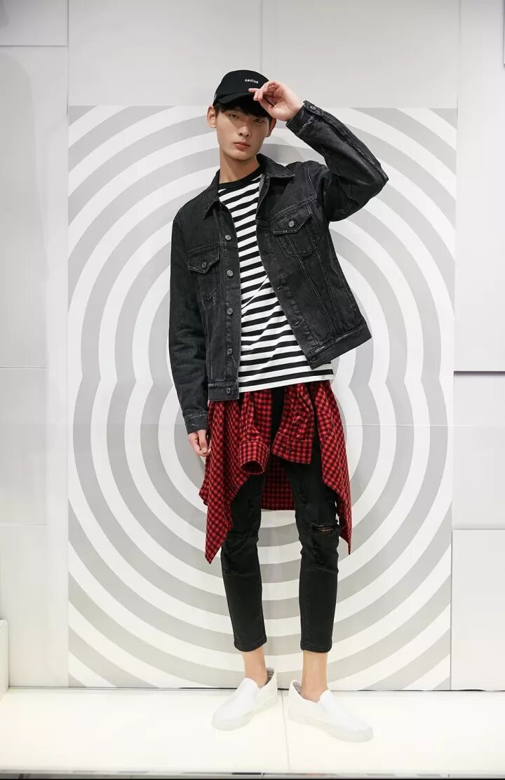 準備經典的黑白搭配,外套用了黑色的修身牛仔夾克,內搭選擇了百搭條紋T,褲子選擇了酷帥的破洞牛仔褲,想要給整身增添亮點,用一件紅色格紋襯衫綁在腰間就搞定啦~