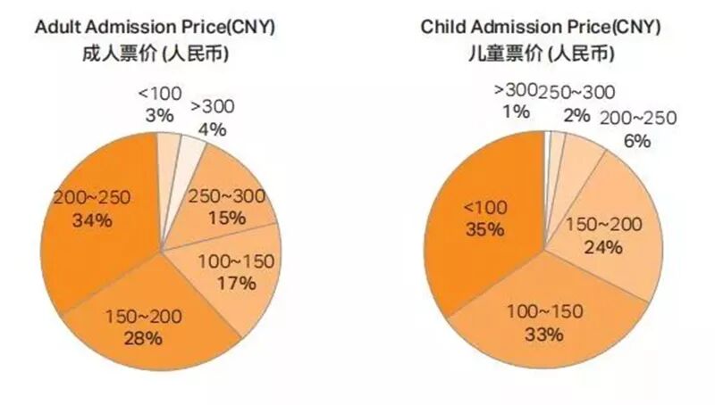 中國現有主題公園成人票定價多位於在150人民幣以上,且較多在200~250人民幣之間,平均價格為200人民幣。兒童票定價普遍低於150人民幣,平均價格則為130人民幣。