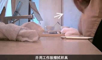 之後還用自己的工作服擦杯子