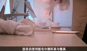 服務生使用臟毛巾擦杯具與餐具