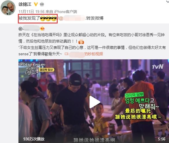 兒子被誇後,徐錦江自己也轉PO了這條視頻,調侃了一下兒子,說 「被我發現了」。
