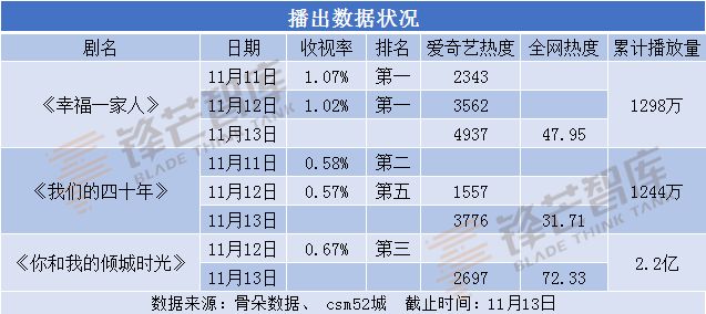 通過統計與對比這三部劇的首播數據,可以發現一些市場規律與受眾喜好。自11月11日《幸福一家人》播出後,收視率便連續兩天登頂。而《我們的四十年》與《你和我的傾城時光》的收視率卻不過是前者的一半之多。