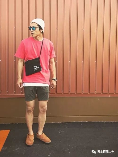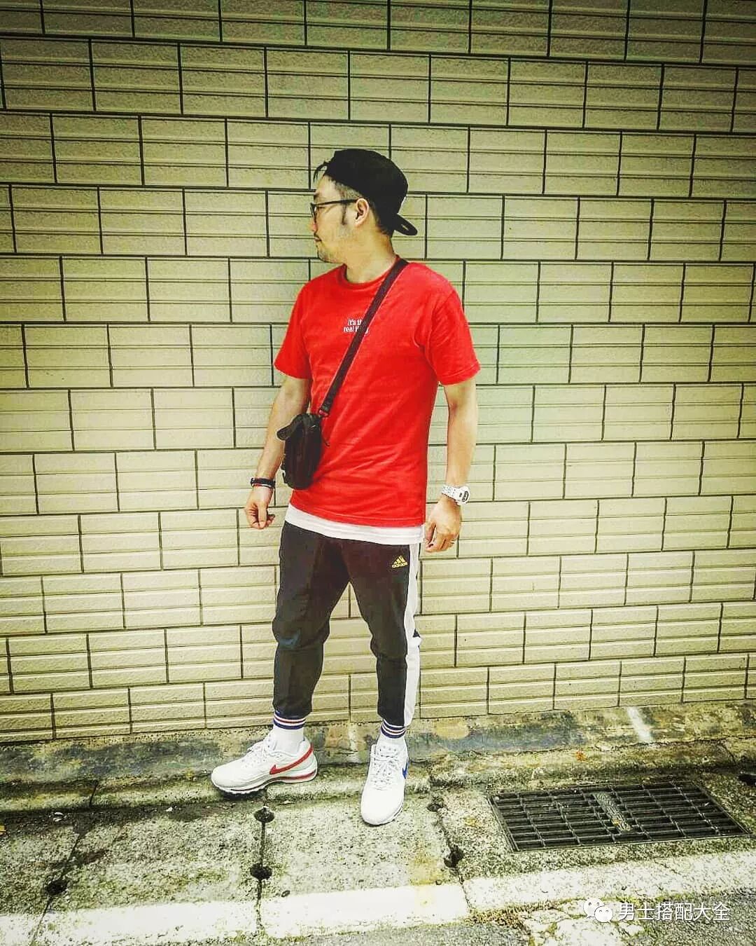 想強調出街頭型男 Look 時,不妨運用色系來展現,比如兩件式上衣混搭,紅加白、藍加白的衝突配色,製造視覺豐富層次,隨性地將小包包掛在脖子上,戴頂魚夫帽與墨鏡,混搭出迷人的時髦造型。