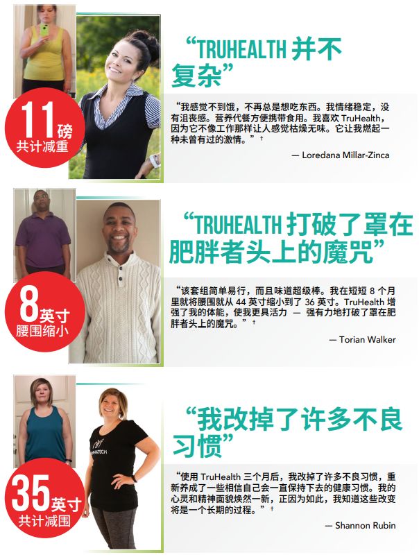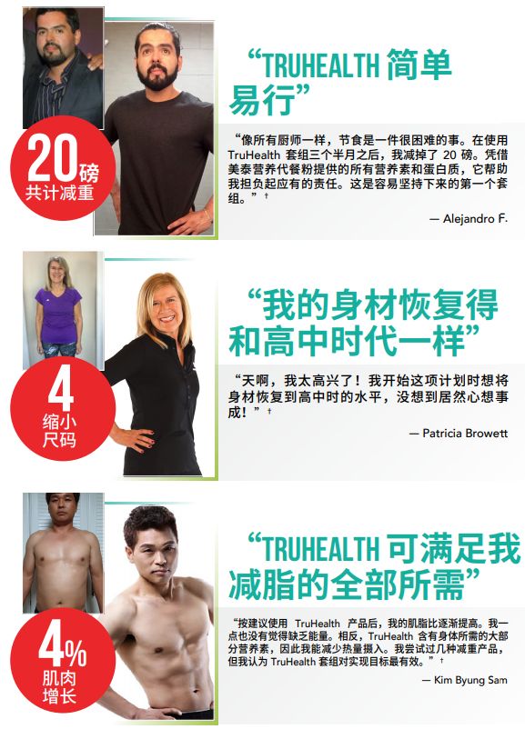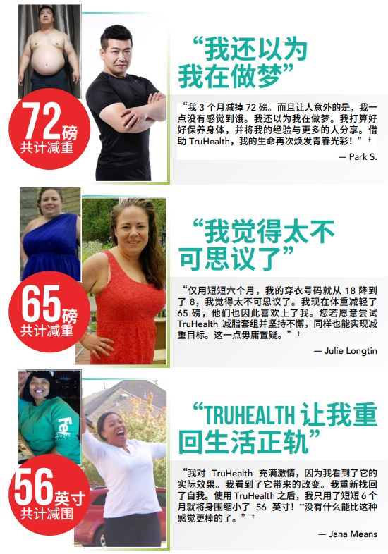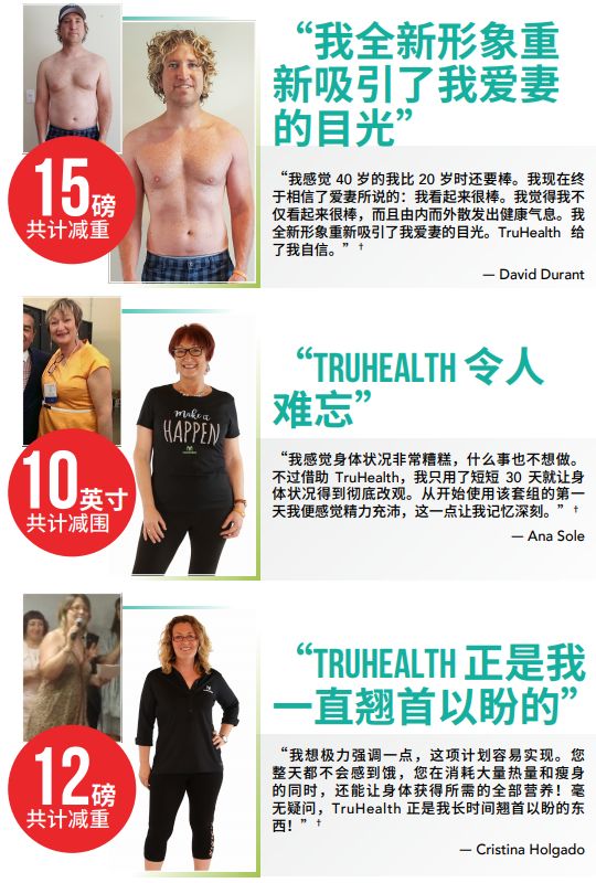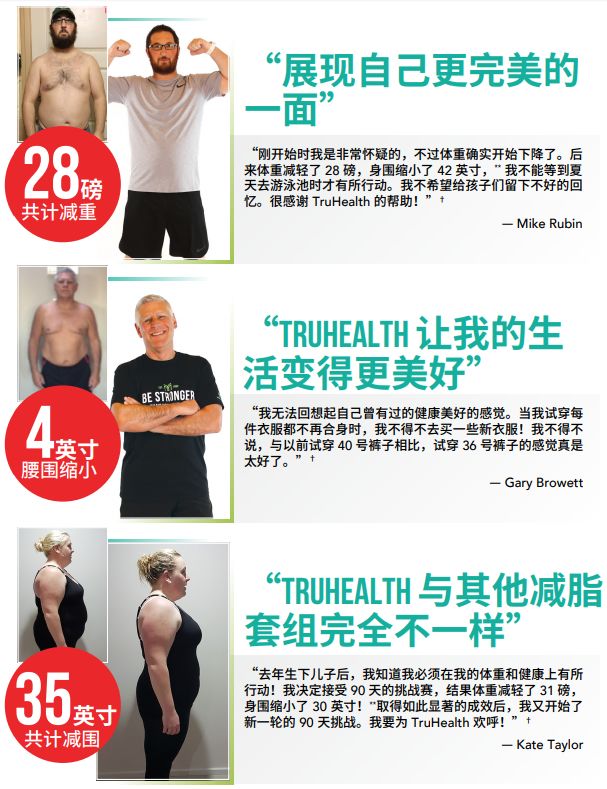 你一定能做到瘦身的目標。TruHealth系統經證明可幫助你更好地減脂塑身,讓你的生活重回正軌。看看體驗過TruHealth套組神奇效果的用戶們的感言,你就能明白健康減脂可以變得很容易。