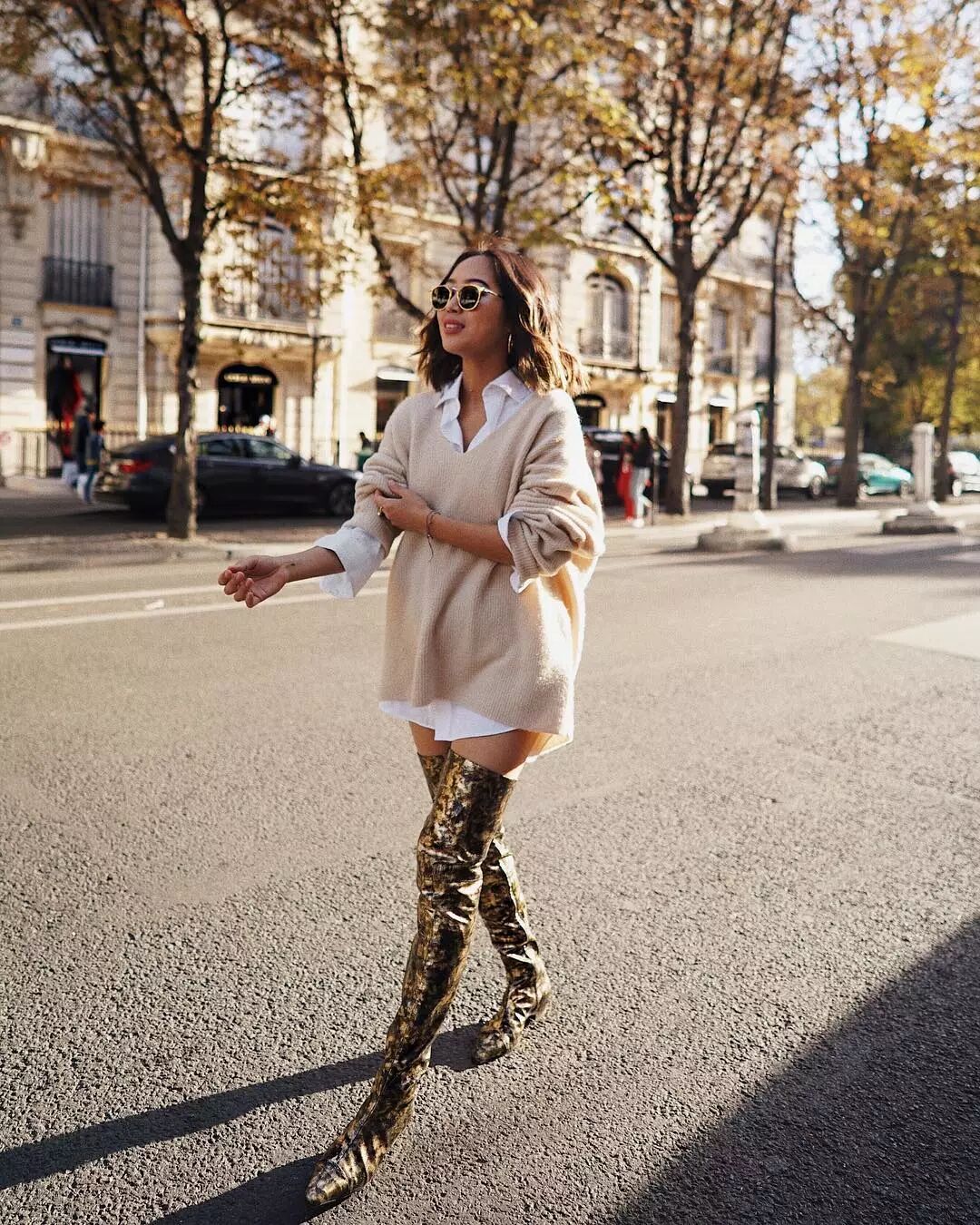 oversize襯衫寬鬆的下擺還能藏肉,藏小肚子,遮住寬胯。很適合像Aimee Song這樣的梨型身材。▼