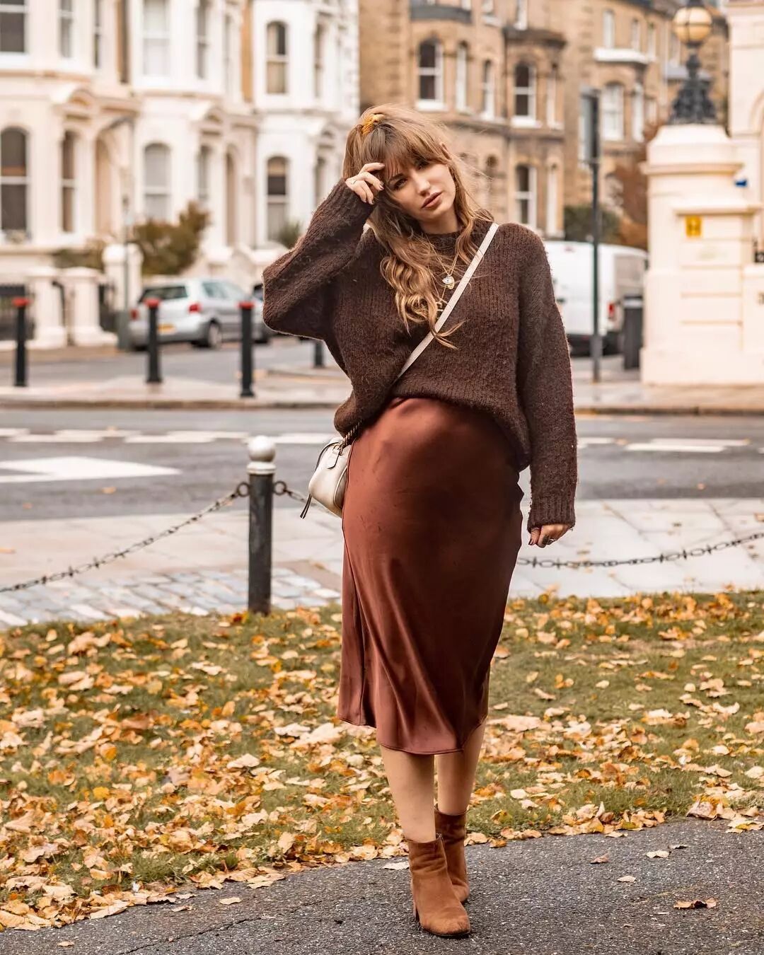 穿厚毛衣再搭配這種真絲裙的時候,也不宜全塞進去,在小腹位置容易形成一些迷之凸起,就不美了~▼
