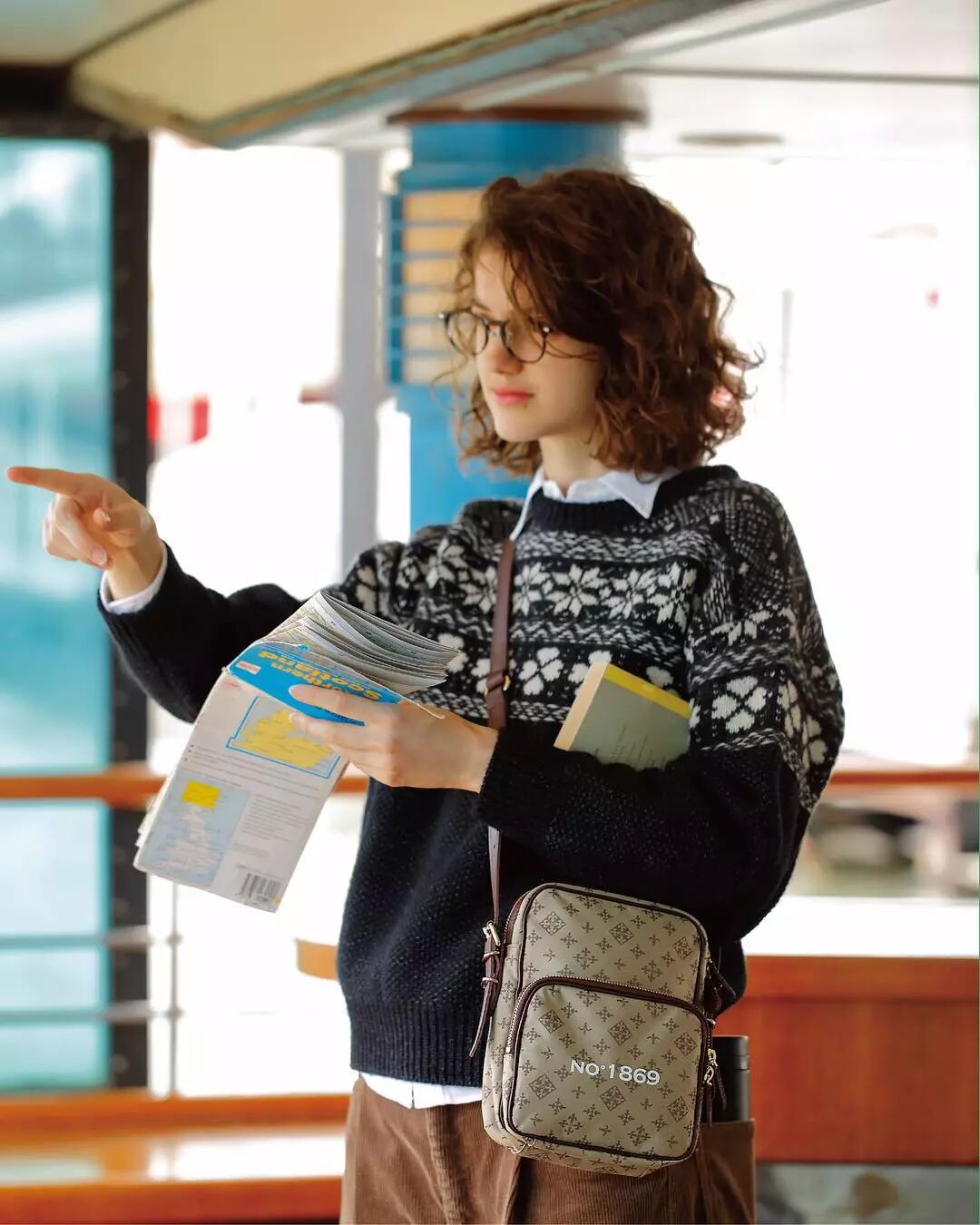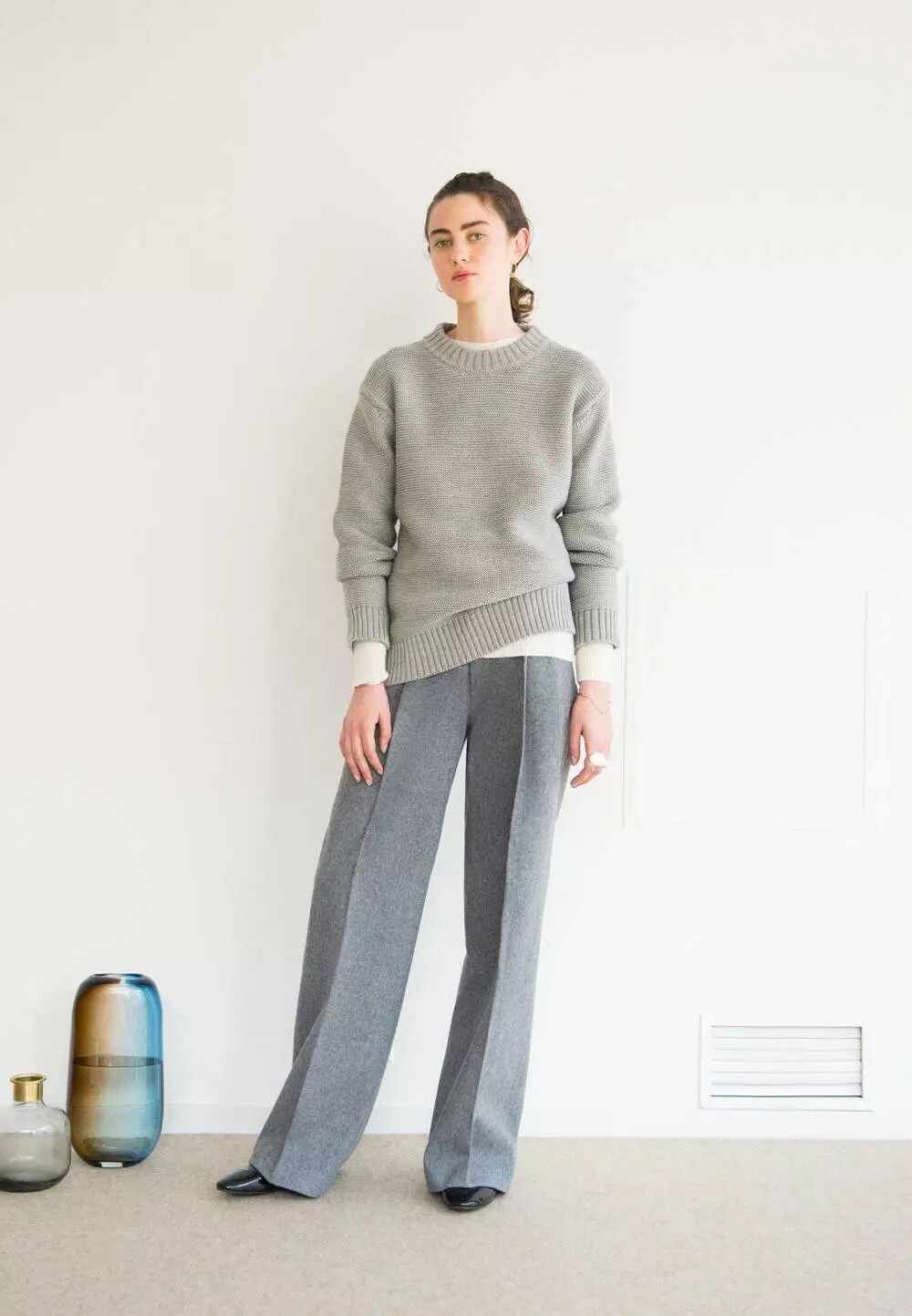 或者內搭的襯衫只比外面的毛衣長一點點,只露一點點邊,修飾一下就好,對整體的比例起不到大影響。▼