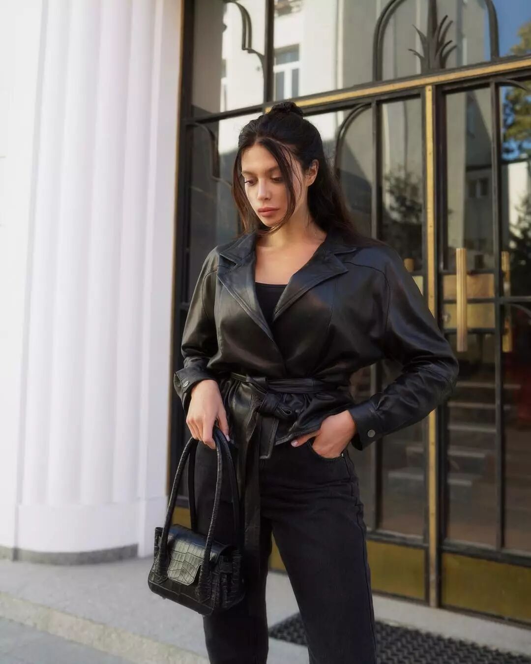 短開衫容易穿得老氣,系上腰帶,提升了造型的精致度。▼