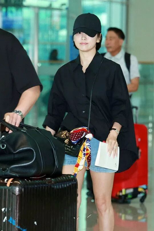 黑色的寬鬆上衣,搭配一條超短熱褲,十分接地氣,機場里美過其他人,可惜身材有些發福,連腿都粗了一圈。