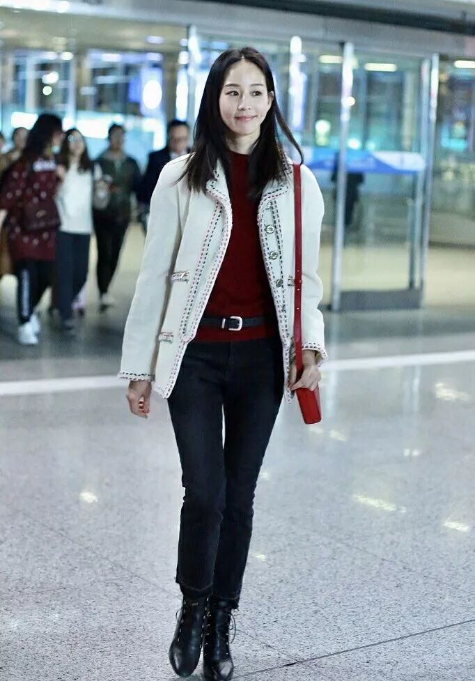 張鈞甯其實長得挺好看的,你看她機場照穿了一件酒紅色的毛衣,並且在肚臍那里系了一根黑色的腰帶,這種顏色挺襯皮膚的,下面搭配一條黑色的緊身褲,外面還穿了一件白色的外套挺休閒。