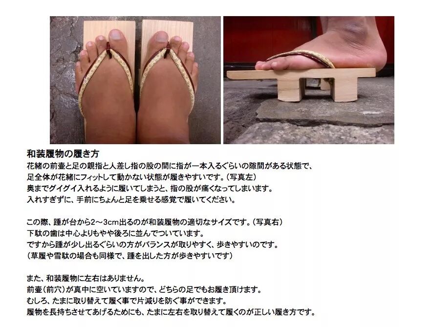 引用自兩個製作傳統日本拖鞋的工坊的科普網站 「辻屋(nakano-tujiya.com)」 以及 「丸屋 (getaya.org)」 ,兩個都有說及經典二齒的 Geta 是如個製作以及穿著方法,就正如侃爺所說,穿著傳統 Geta 必須將後跟推後一點,讓後跟退出鞋身之外,這個方法是讓身體更平衡。