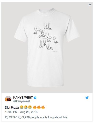 見慣時尚世面的 Hater 們當然不會以 「西裝配拖鞋」 作說辭來黑我們的侃爺,轉以 「鞋不合腳」 的理由借題發揮,訛稱富可敵國的侃爺竟穿不合腳的鞋子,極為可笑,而時尚界最出名的滋事分子,時常毫不留情揭品牌 「抄襲」 陰私的 Diet Prada 當然也不會放過這樣的機會,推出 Print Tee 以謀利,一面黑一面圈錢,極為可恥。