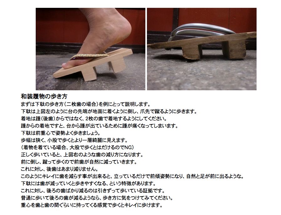 雖然它的設計好像很理所當然地讓你把那人字的搭帶卡在皮膜,但大家要是真的穿過日本拖鞋,你會知道以最懶的方法拖動鞋子,你將會十分疼痛難受,更重要是,日本拖鞋繼承著中國傳統鞋履設計,要是你有看那個什麼什麼攻略,你會發現那些娘娘以及可愛的明玉,鞋子前方都是斜的,而目的就是讓她們走路時,把鞋身向前壓,以減少後跟與地面的磨擦以方便走路,穿日本的二齒 Geta,正確的走路方法也是這樣,這樣的方法有效地讓走路者每步都是用兩齒著地,從而減少只是後跟著地而受傷的機會,上圖丸屋就是告訴你,正確的走路方法會使 Geta 前齒磨損,走路時要小心,也要多檢查自己的 Geta。
