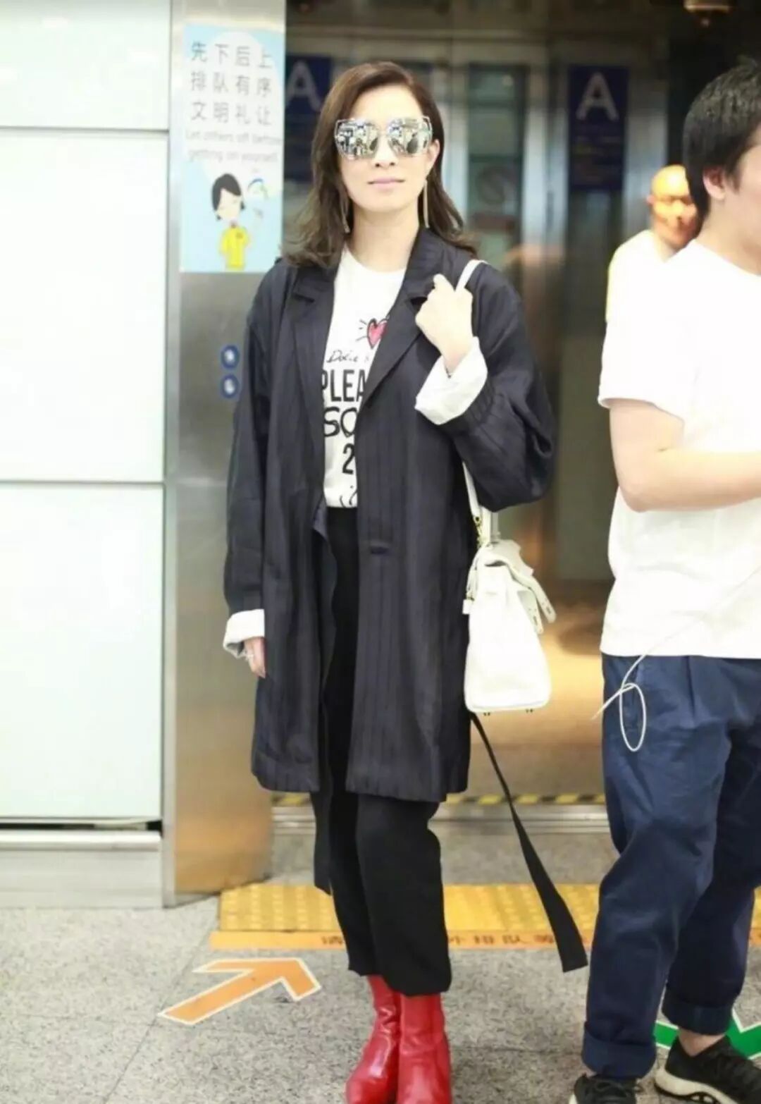機場這身混搭還真是不協調啊,雖然紅黑色是經典的配色,可是這一身黑色裝搭紅色短靴,很突兀呢,一點都沒有美感。