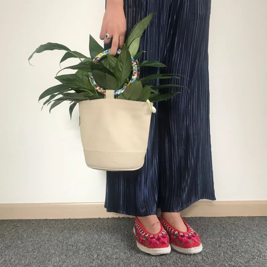 大家都知道,小寶滿6個月之前,我一直背帶抱著他工作。像手機這種小東西拿在手里不方便,裝口袋里經常會遇到:右手抱著寶寶,放在右口袋里,左手夠不著;左手抱著寶寶,放在左口袋里,右手夠半天…….諸如此類的尷尬。另外還有拉鏈包包要開拉鏈,扣子要解扣子等各種煩不勝煩。後來用再造衣銀行的三角手提包,方便了,大小也十分合適。但是我那只三角手提包是耗牛毛,實在不太適合炎熱的夏天,於是就有了這只盆栽包。