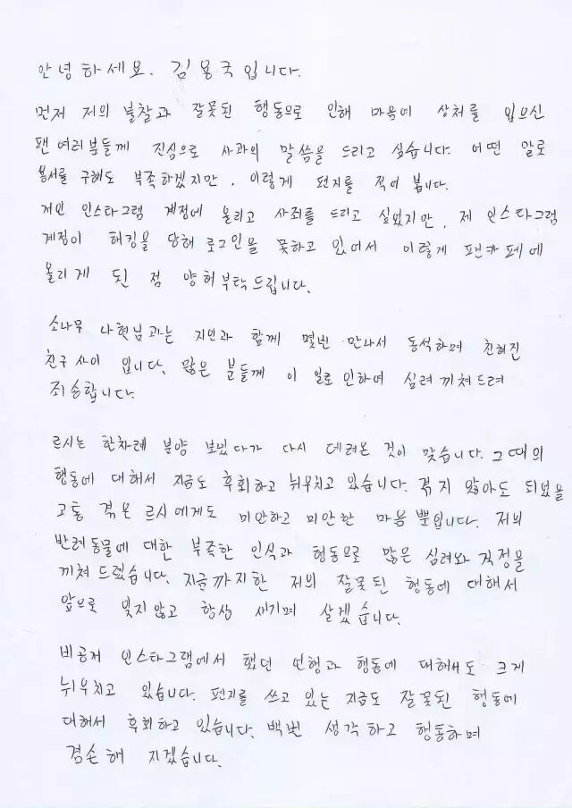 首先是不承認與金娜賢是情侶關係,只是朋友;其次對貓這件事的解釋和公司一毛一樣;最後承認了那個小號是他自己的,對自己發出的內容感到後悔。
