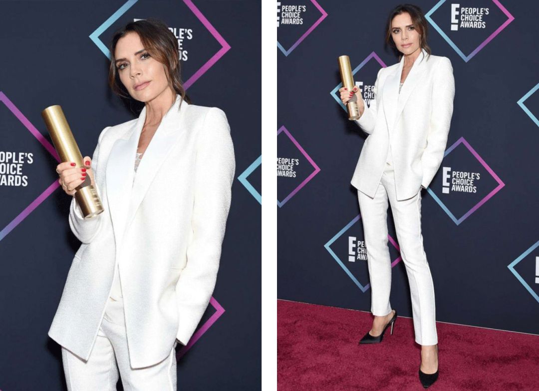 4.美國人民選擇獎最近揭曉了,貝嫂當選時尚偶像獎絕對是實至名歸,同名品牌做得風生水起,自己就是個行走的品牌代言人。像這次來領獎也穿了自家的白色西服套裝。