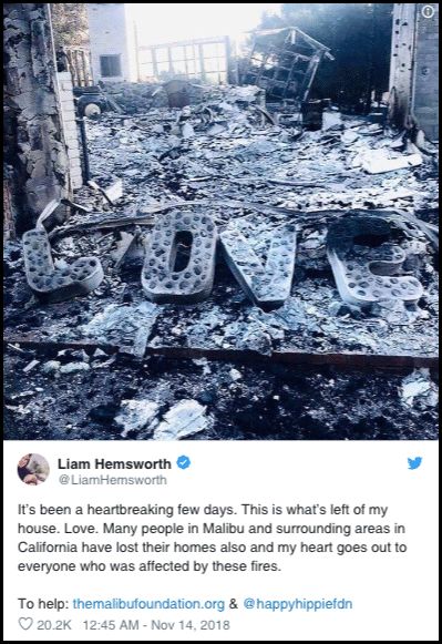 雖然這次山火不是歷史上最大的一次,卻是死亡人數和失蹤人數最多的一次。很多人的家都在這次山火中被吞沒。其中受到牽連的名人包括Will Smith、Lady Gaga、Kim和侃爺一家等,像我們知道的麥莉和捶弟的家就被燒得一乾二淨,
