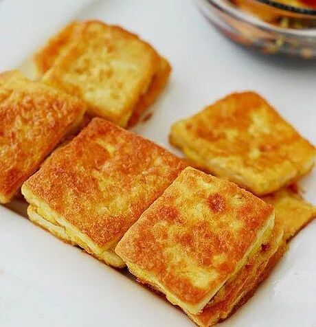 1.將豆腐切成薄片,放入鍋中用少量油煎至兩面金黃;