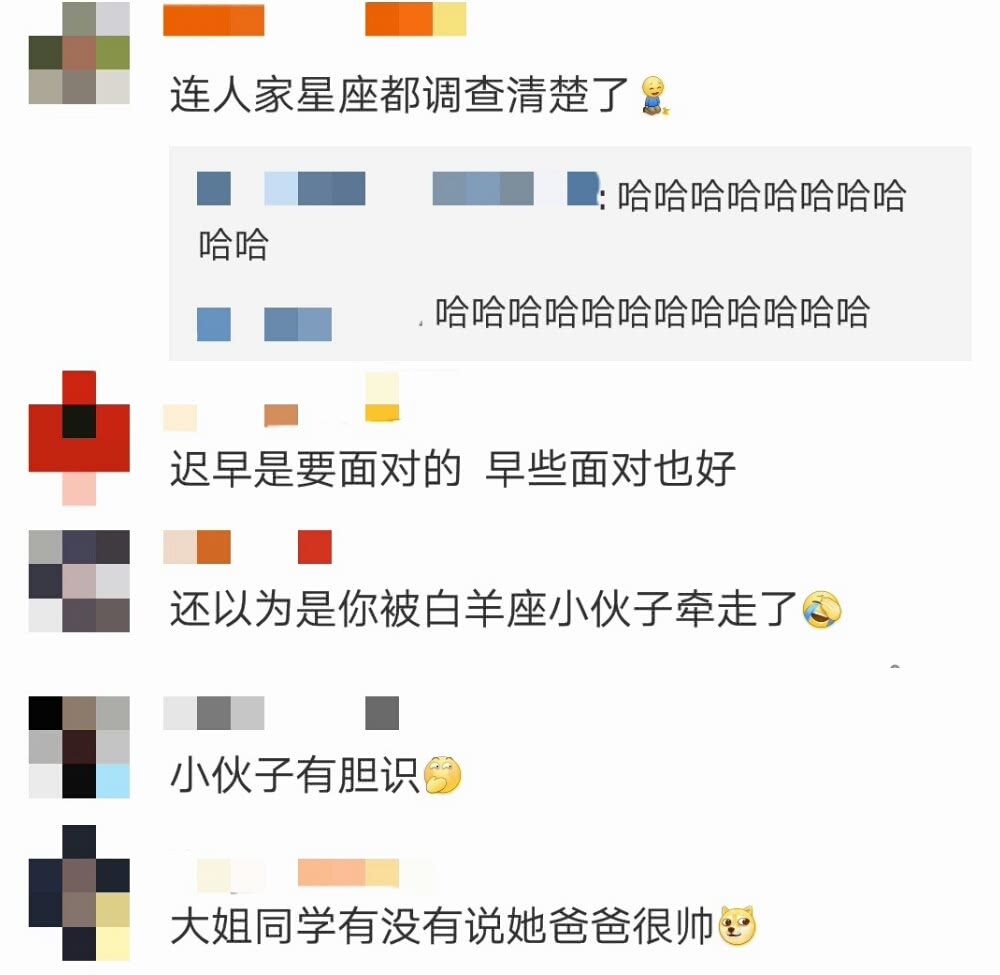 網友們紛紛調侃:連人家星座偶讀調查清楚了;遲早是要面對的,早些面對也好;還以為是你被白羊座小夥子牽走了;小夥子有膽識;大姐的同學有沒有說她爸爸很帥……