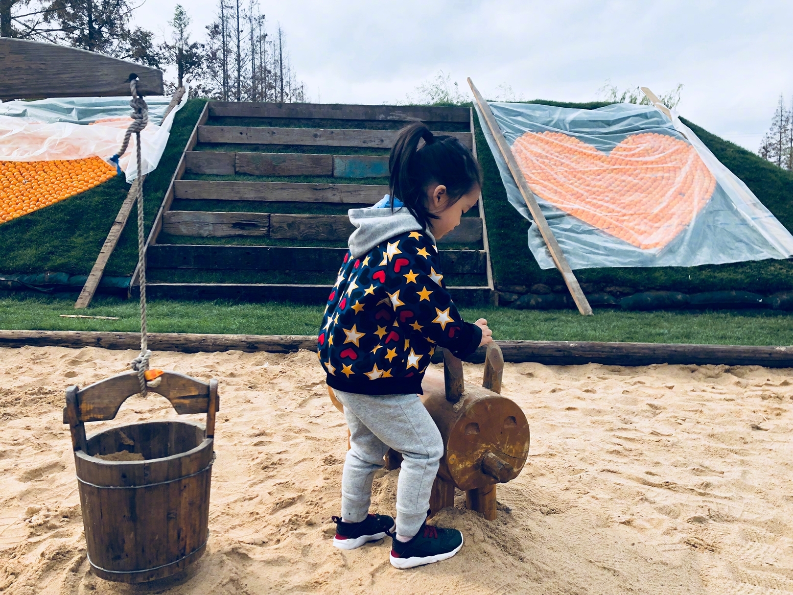說白了,這應該就是城里人都非常向往的農家樂。水桶特別的有年代感,王唯伊想要去坐「小木馬」。在這里值得強調一下的是,我們王大姐只有三歲哦,不是四歲更不是五歲。
