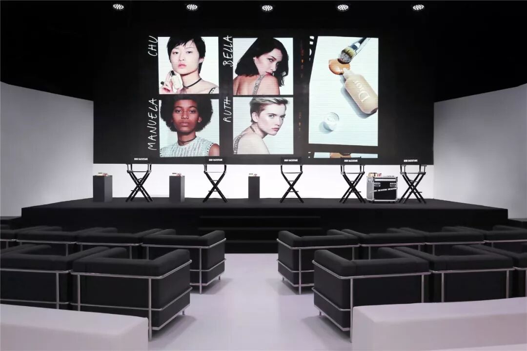 活動當晚,以黑白兩色為主基調打造的梵木創藝區獨具DIOR迪奧時尚氣息,一系列出自大師之手的後台妝容視覺圖環繞四周,後台彩妝新品一字鋪陳,全新透明包裝設計使人即刻得以一窺豐富的色彩選擇。