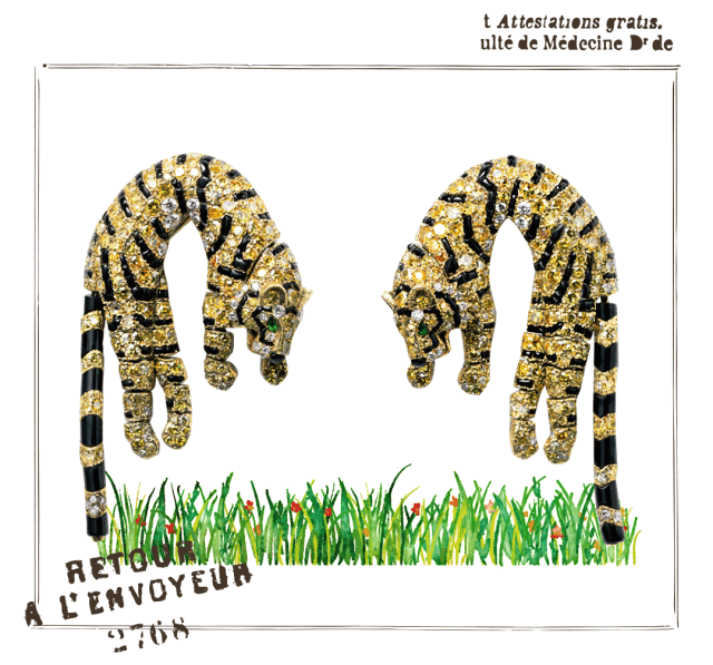 鐘愛老虎的芭芭拉還為自己定制了一枚夾扣式胸針和一對立體耳夾,老虎的四肢和尾巴都是鉸接式的,可以隨身體的動作自由擺動。