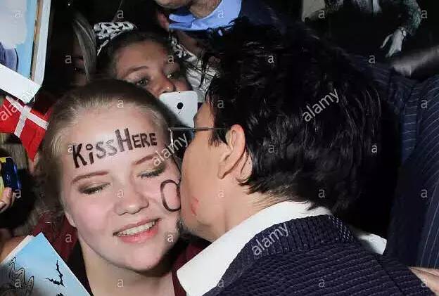 粉絲在額頭上寫「親這里~」,於是得到了一個甜甜的臉頰吻。