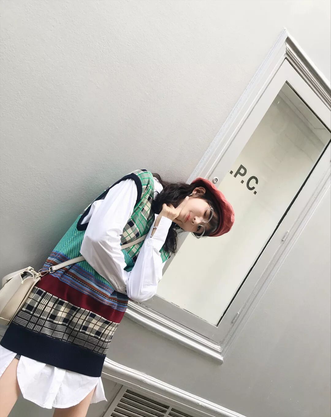 ②外面的襯衫主要作用是造型加分,所以要選擇豎條紋、格紋等這樣吸睛的元素,領子一定要大大的敞開,除了讓大家看見「我里面還穿了一件襯衫哦」,也是防臃腫之嫌