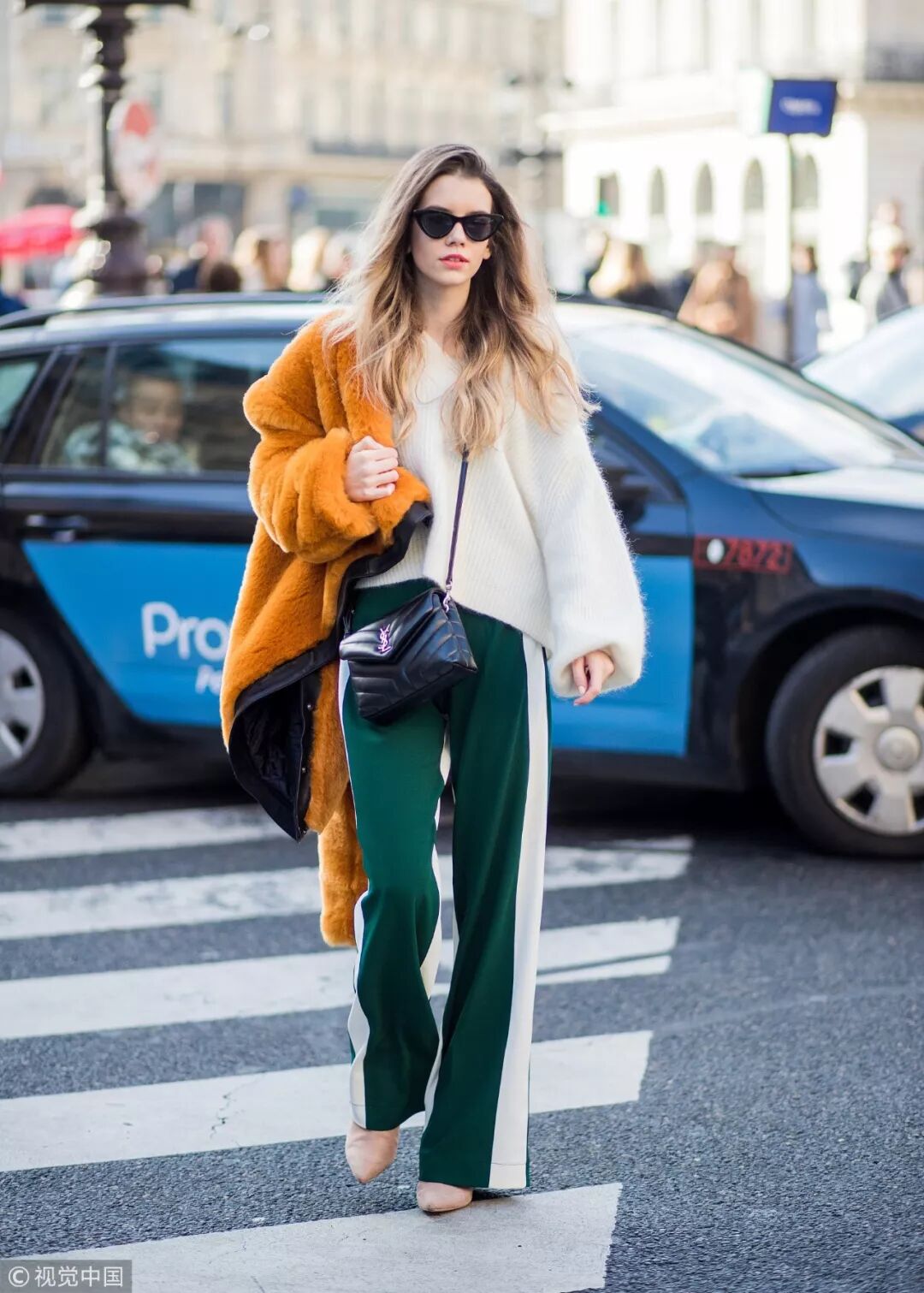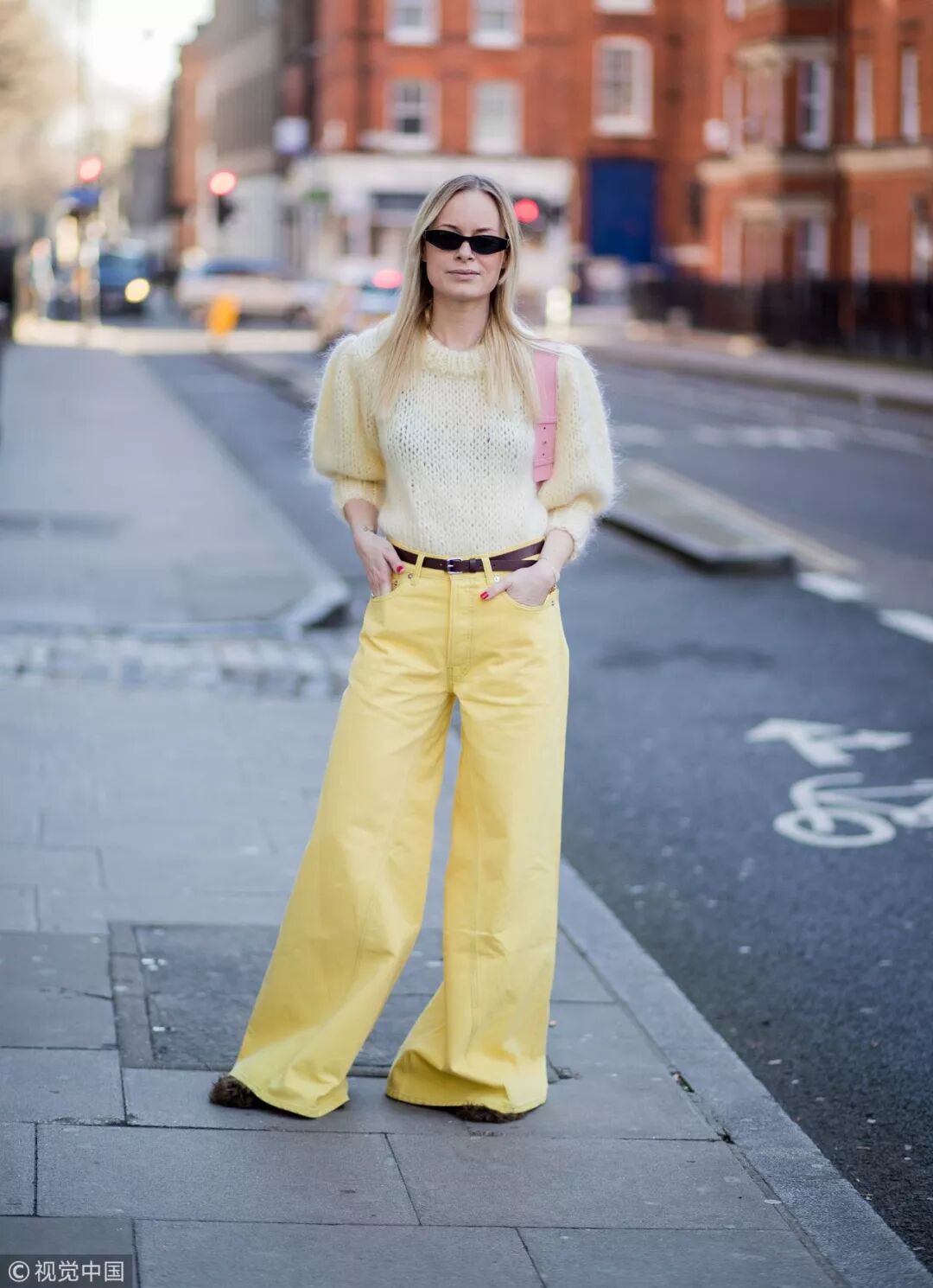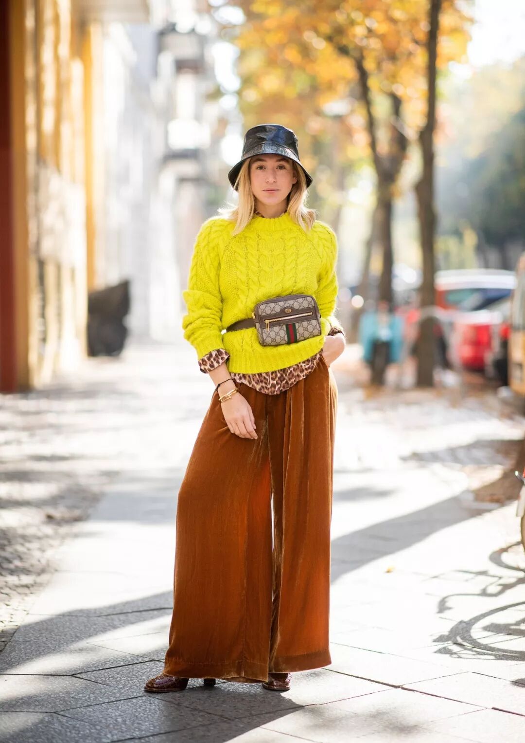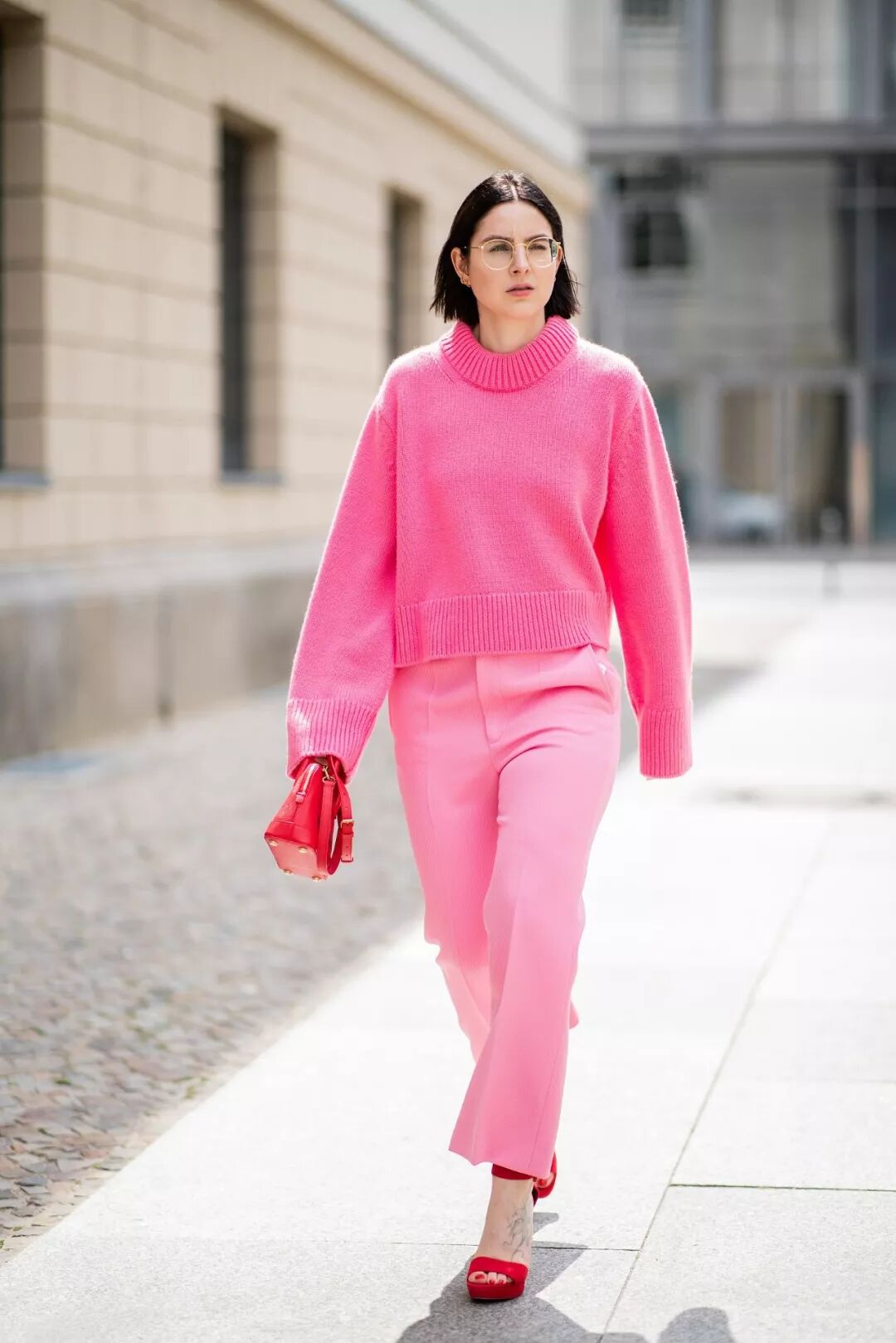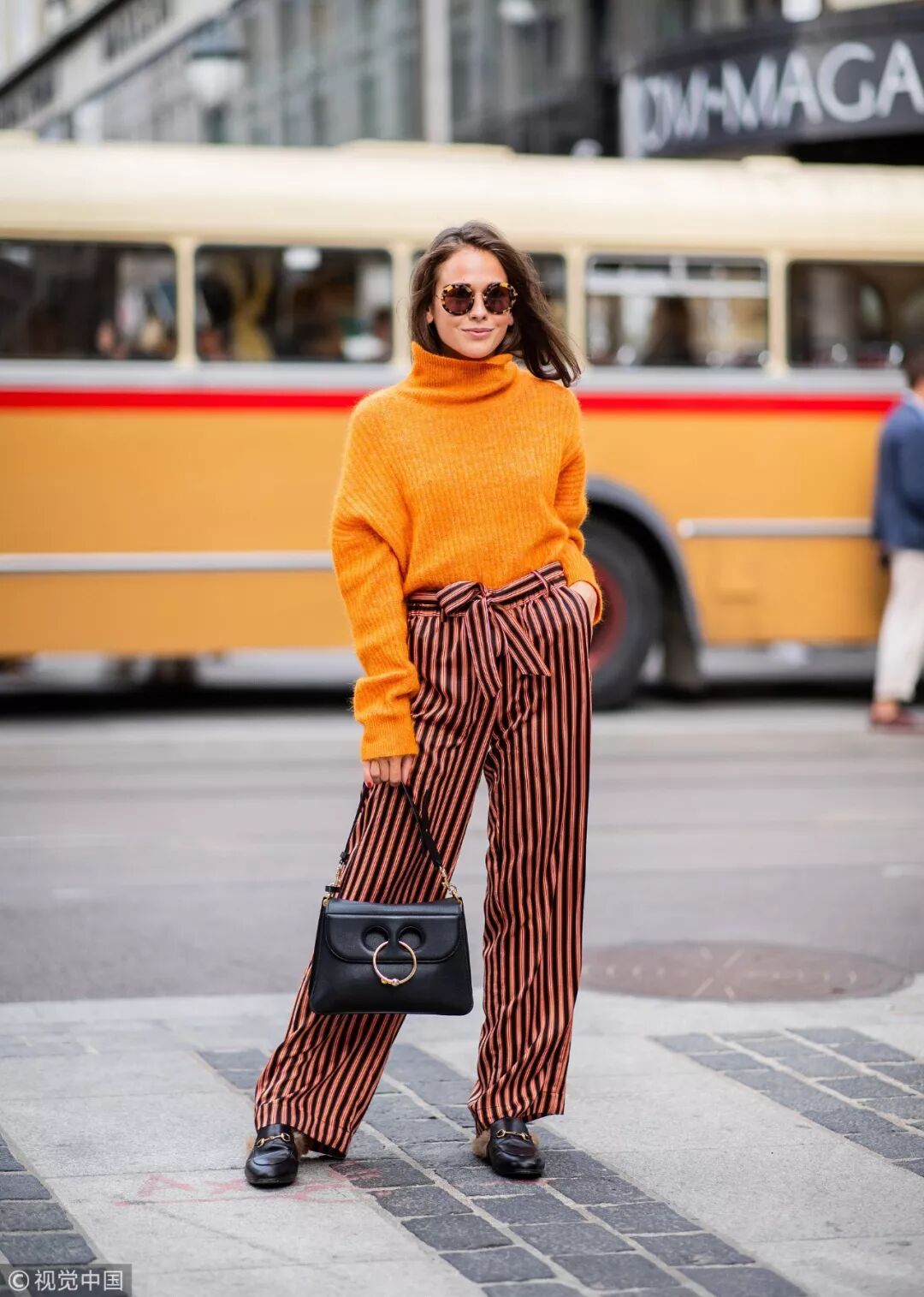 毫無疑問,純色毛衣與幾何圖案闊腿褲動靜兩相宜,高亮的純色毛衣與相同色系的條紋褲相搭,黑色條紋抑制了色彩的浮誇感,與冬日更相配。