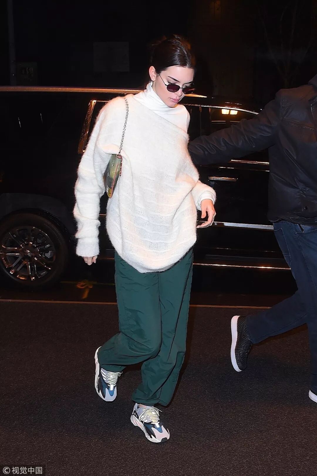 寬鬆的毛衣總算能夠給人帶來舒適感,oversize毛衣+闊腿褲也是如此,白色馬海毛斜肩毛衣MIX墨綠色闊腿褲的造型讓肯豆時尚又活力,白色高領上衣更與白色毛衣形成假兩件的既視感。