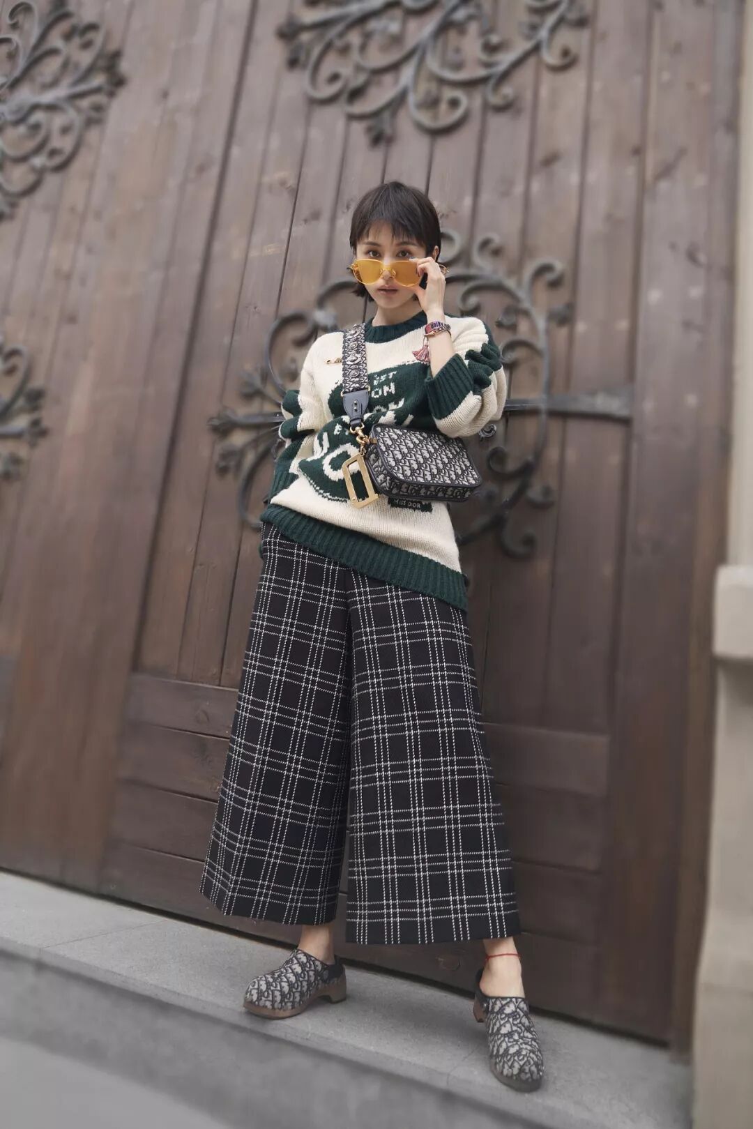 格紋闊腿褲似乎比純白造型更具立體感,褲腿的開衩設計增加了甜美因素,十分喜人。