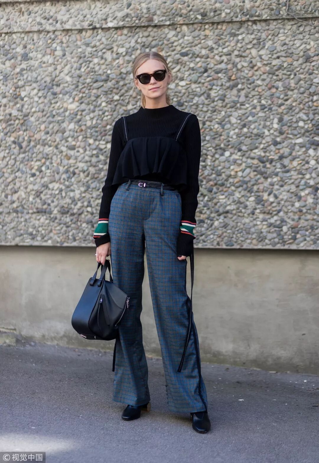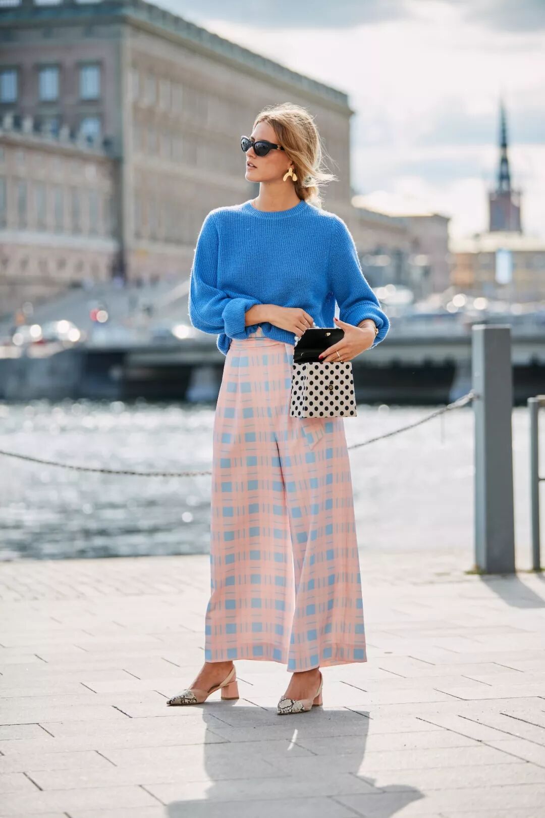 藍色與馬卡龍色系的藍粉格紋闊腿褲相搭,陣陣清新撲面而來。