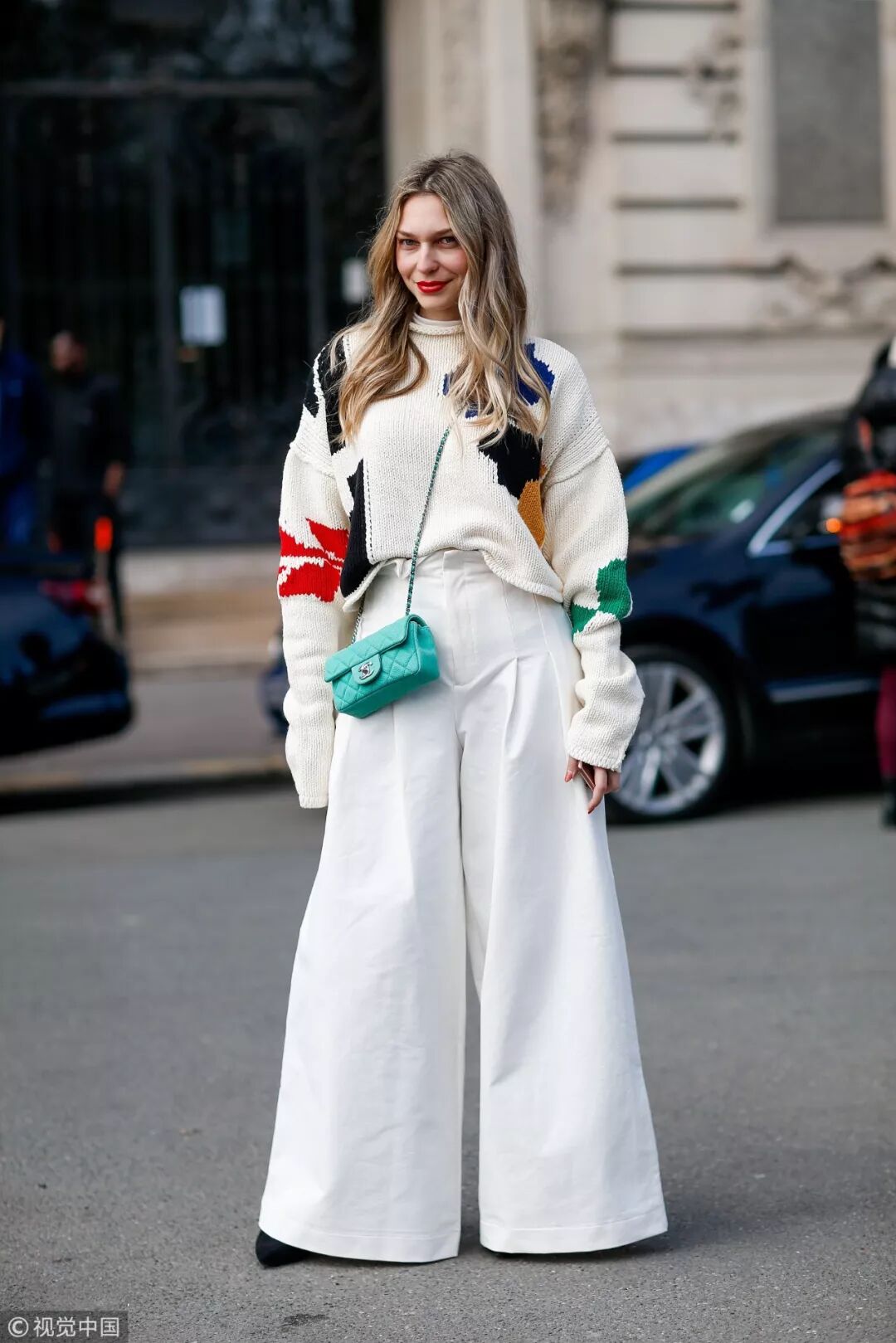 big size闊腿褲形似長裙,輕鬆帶出女性的嫵媚。潮人身穿白色毛衣下搭big size闊腿褲,彩色色塊為造型帶來活力,清爽宜人的造型輕鬆點亮初冬街頭。