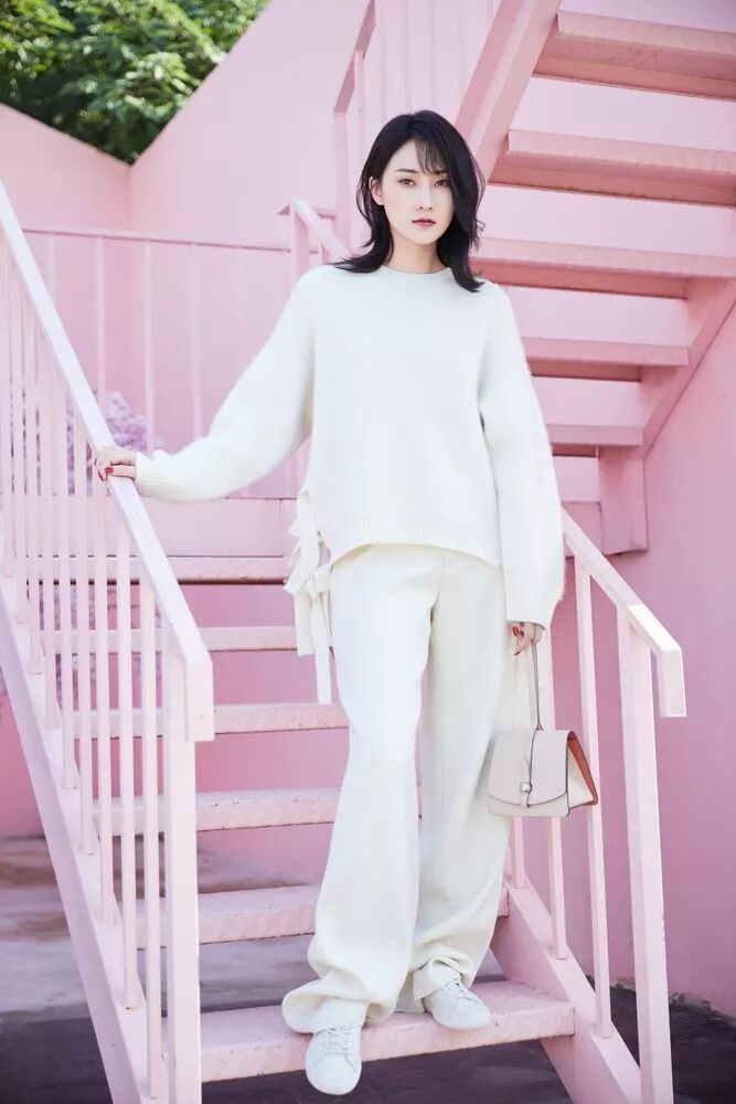 林鵬身穿米白色毛衣搭配同色毛呢闊腿褲,知性與俏皮碰撞,毛衣下擺交叉式系帶盡顯可愛小心機,整身Look溫婉大氣,為清冷的秋季增添不少暖意。