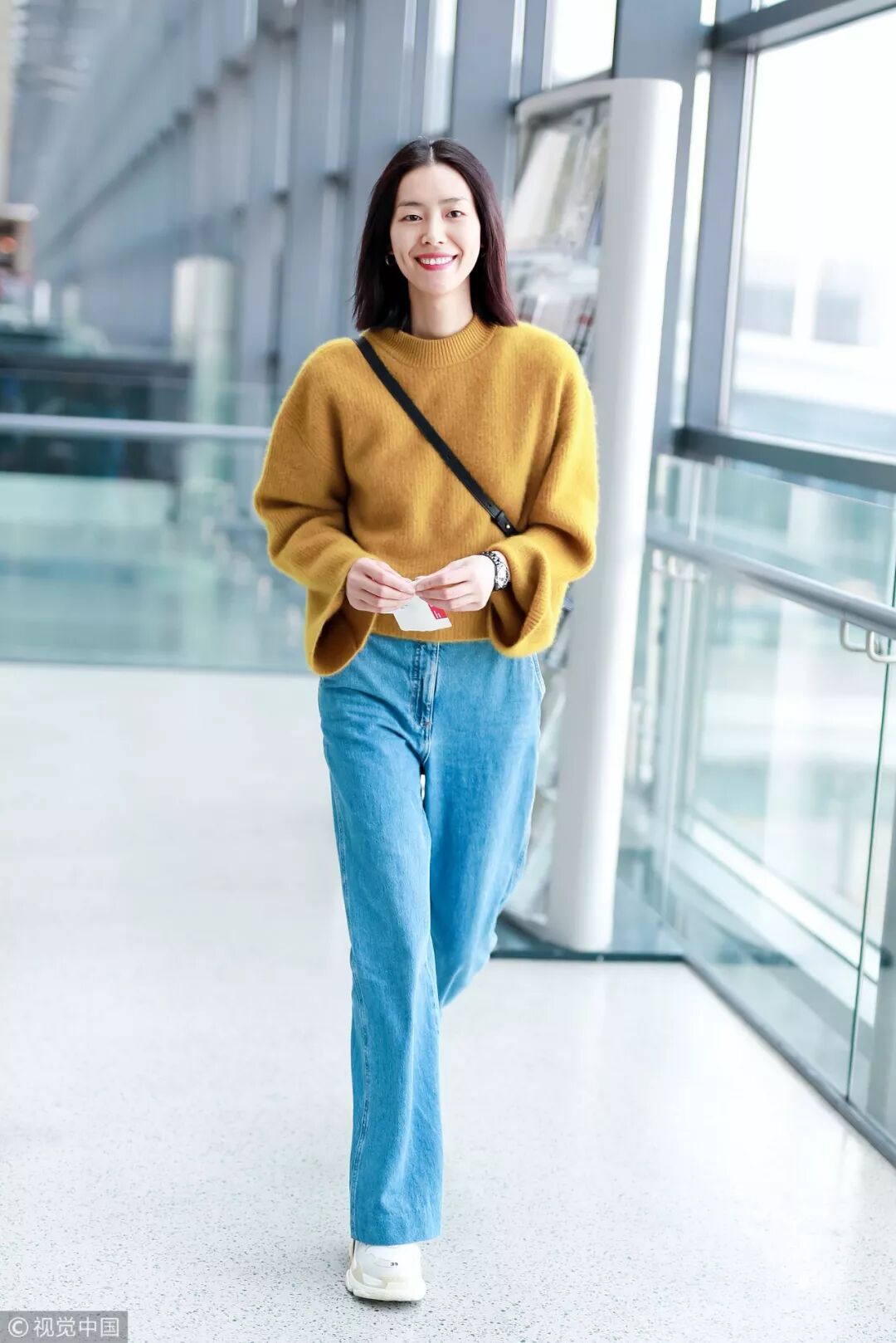 寬鬆的短款條紋提花毛衣與收腰的牛仔闊腿褲相搭,充滿立體又高挑的既視感妥妥穿出一米八大長腿。