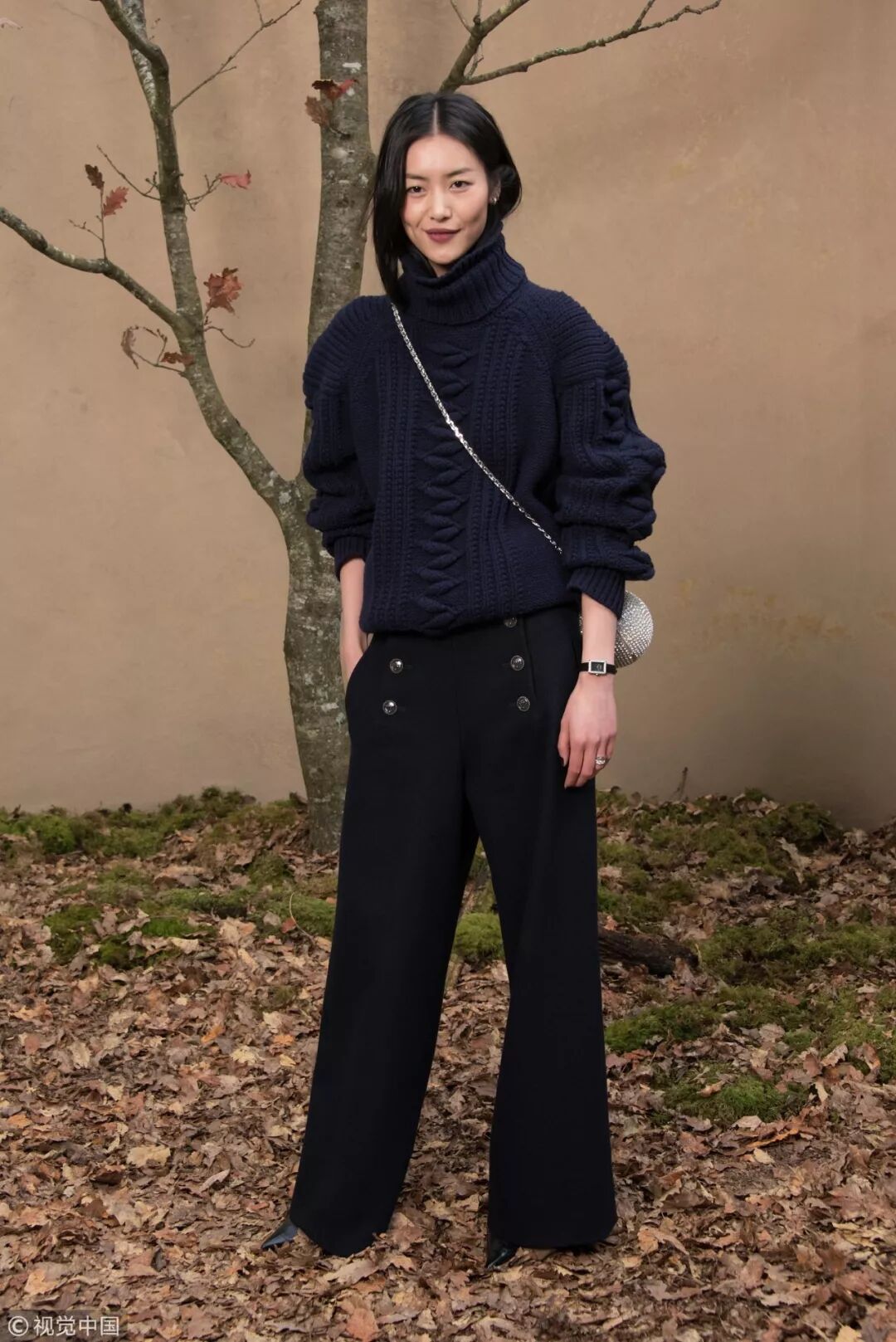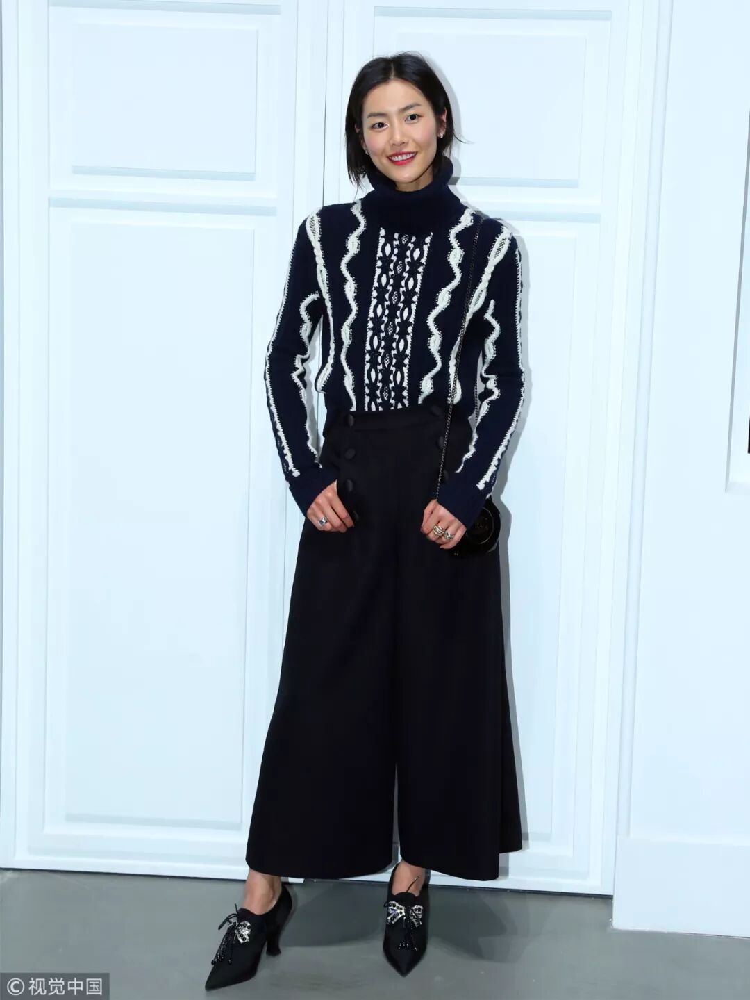 大表姐劉雯絕對是毛衣+闊腿褲的鐵粉之一!藏藍色提花寬鬆毛衣下搭黑色雙排扣闊腿褲,英氣的造型氣勢十足。