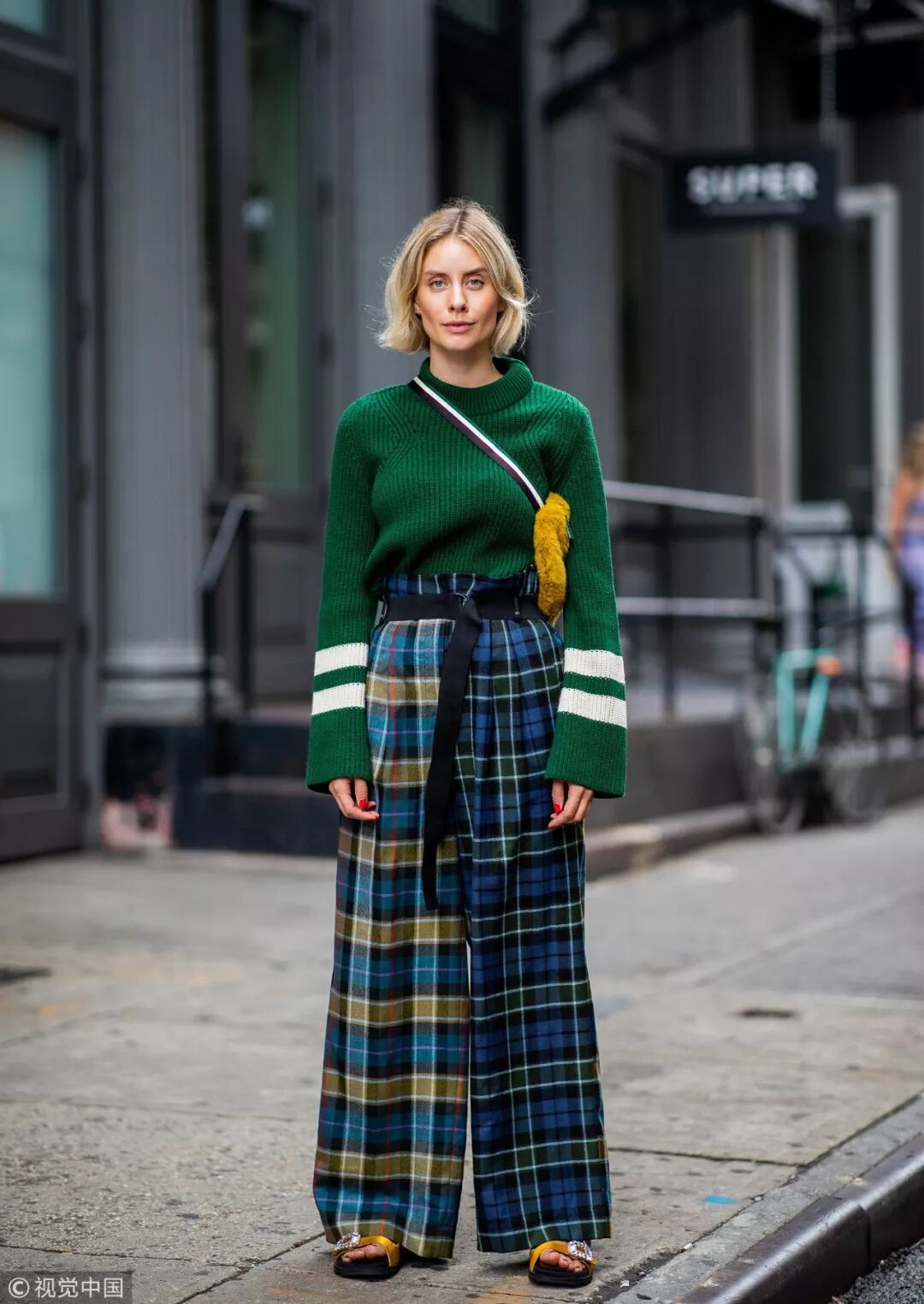 綠色毛衣遇上大格紋闊腿褲,撞色設計的褲腿俏皮個性,穿出日式的慵懶。