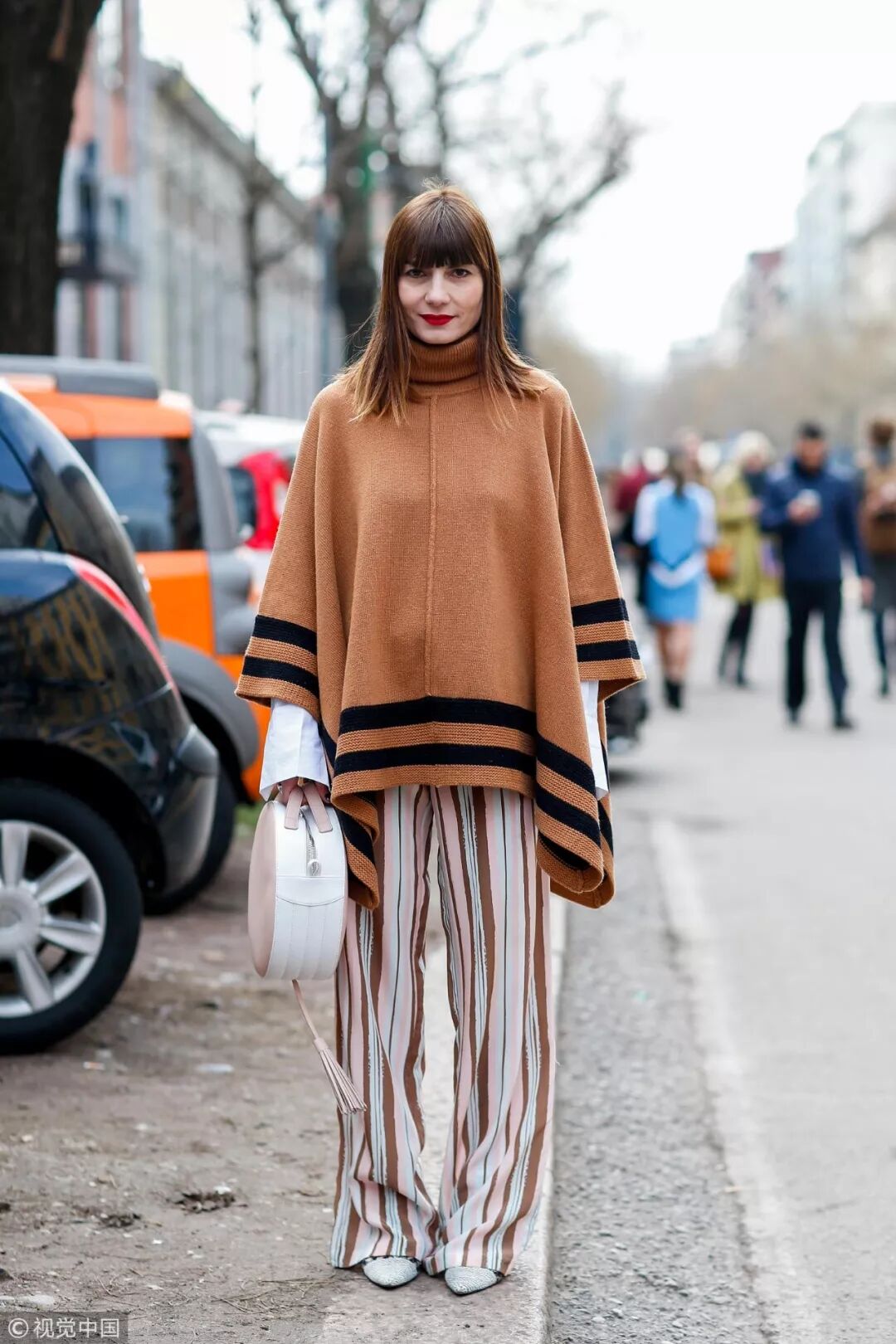 這件看似鬥篷的棕色oversize毛衣與棕色條紋闊腿褲過渡流暢,造型清雅大氣。