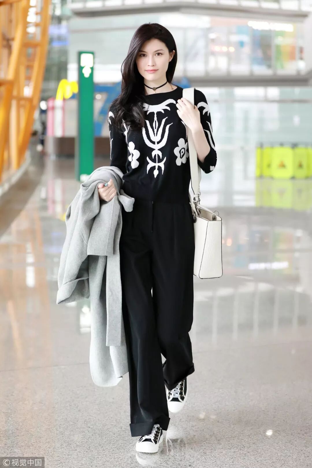 美搭總是能引起共鳴,何仙姑也選擇了黑色毛衣+闊腿褲的搭配,對稱的白色花紋襯托出白皙膚色,絕對是用黑色演繹甜美的完美示範!