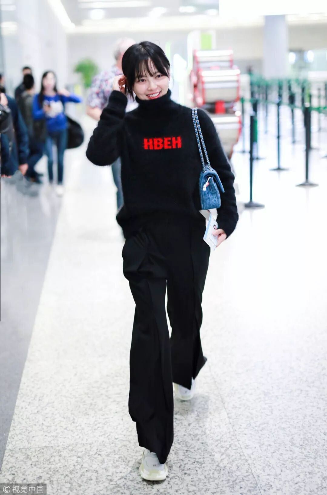 辛芷蕾身穿高領黑色毛衣下搭黑色闊腿褲,胸前醒目的紅色字母打破了沉悶,顯得十分乖巧。