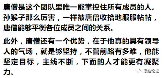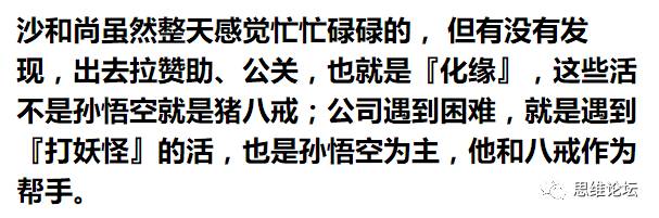 比如最近公司里大家都比較散漫,沒有戰鬥力,唐僧就會拿八戒說事,你看看你上班一點都不認真,你們技術總監孫總都忙死了,你們在這玩,還想不想幹了,這其實是說給所有人聽的。