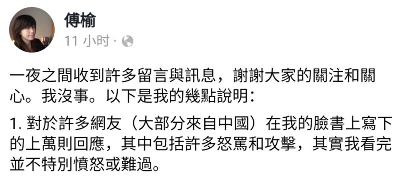 金馬鬧劇18個小時以後,傅榆在facebook上發布長文,開頭如下——