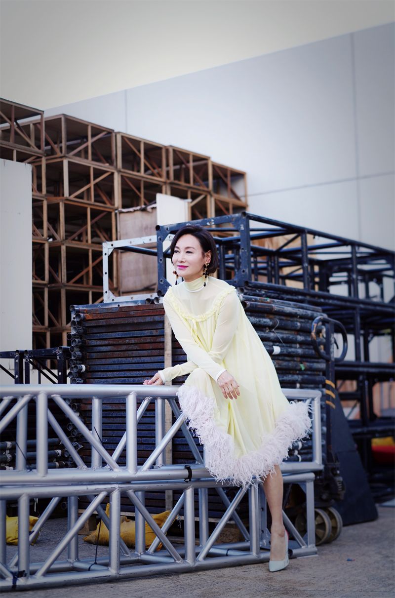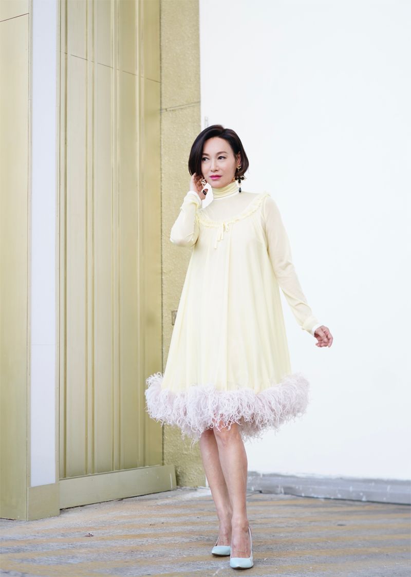 58歲的惠英紅身著Miu Miu 2019年早春系列,經歷過人生海海的她沉穩而從容,鵝黃色連衣裙與她的個人氣質相得益彰。